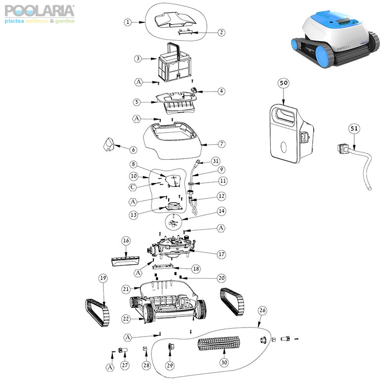 Si estás buscando repuestos para el robot Dolphin C5 te encuentras en el lugar adecuado. Compra online y recibe con total comodidad los recambios que te permitirán restablecer las prestaciones originales de tu limpiafondos automático. Si necesitas algún recambio del despiece no disponible para la compra online, contacta con nosotros y procederemos a darlo de alta.