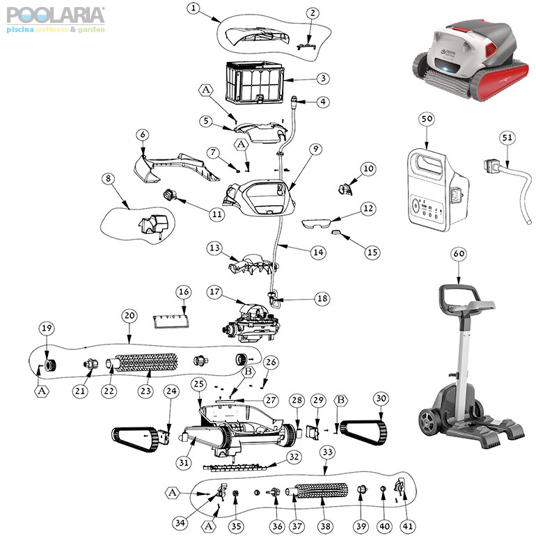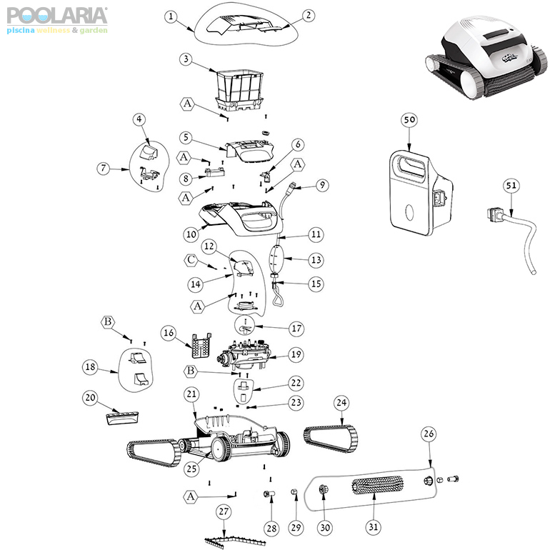 Si requieres piezas de repuesto para tu robot limpiafondos Dolphin Zenit 70, aquí podrás adquirirlas fácilmente desde la comodidad de tu hogar. Sustituye los componentes que han sufrido desgaste y recupera la eficacia original de tu equipo. En caso de que necesites una pieza del despiece que no está disponible para compra online, contáctanos y nos encargaremos de habilitarla para ti.