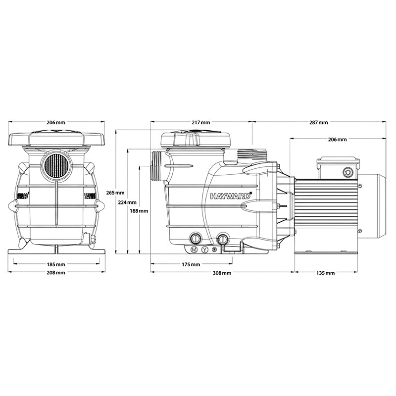 Bomba de filtración Hayward que destaca por su alta eficiencia, calidad de fabricación y precio contenido.| Referencia | Potencia | Longitud | Peso | Entrada / Salida | Caudal (a 8 m columna de agua) | Potencia absorbida P1 | Potencia cedida P2 | Amperaje |