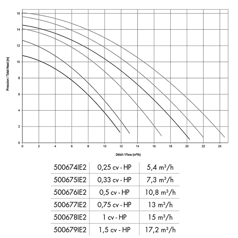 | 500678IE2 | 1 CV | 504 mm | 9,16 kg | 50 o 32/38 mm | 15 m³/h | 1000 W | 730 W | 4,36 A |