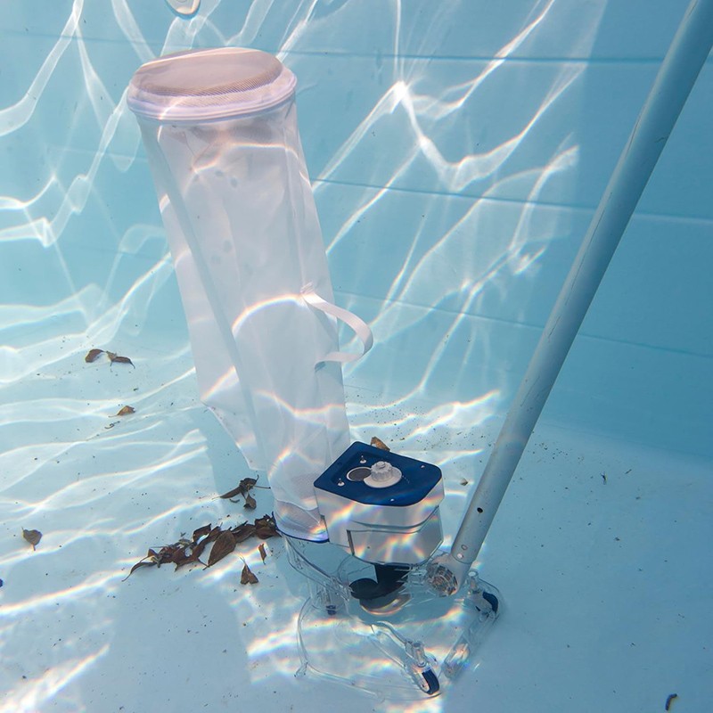 - Limpiafondos eléctrico a batería diseñado para la recogida de hojas y residuos en piscinas elevadas y enterradas.