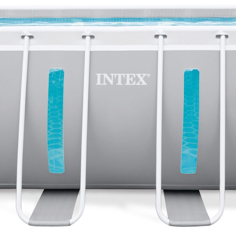 Las piscinas Intex ClearView Prism Frame Premium cuentan con una innovadora ventana panorámica integrada en su estructura metálica tubular, proporcionando una experiencia única al permitir una vista clara del entorno submarino.