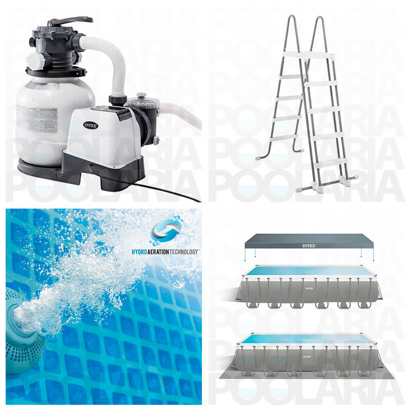 - Depuradora de arena de 7.900 l/h con filtro y bomba (tiempo de depuración: 4 horas). Nuevo modelo con tecnología Intex Hydro Aeration para la oxigenación del agua.