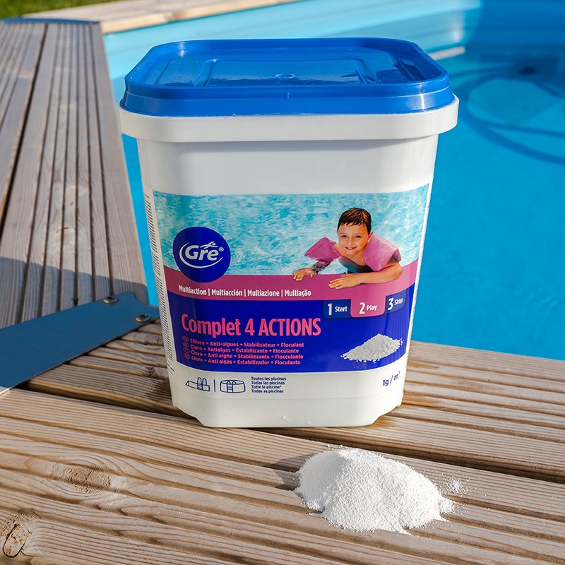 - Tratamiento de mantenimiento: con el pH del agua ajustado, verter 1-2 g de producto por cada m³ de agua en un recipiente con agua y repartir dicha solución sobre la superficie de la piscina por un igual.